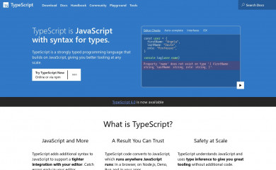 TypeScript extends JavaScript by adding types to the language. TypeScript speeds up your development experience by catching errors and providing fixes before you even run your code.